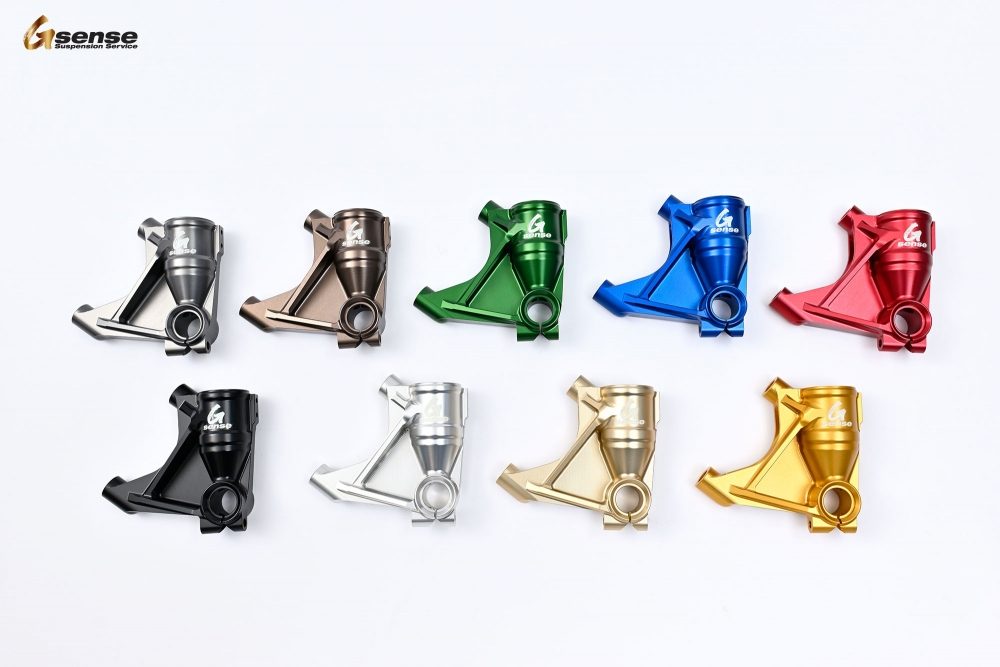 OHLINSの倒立フォークと正立フォークのカラーオーダーシステムは、アウターチューブとフォークボトムを基本に、キャリパーサポート、トップキャップ(プリロードアジャスター部分は除く)、フェンダーステーのカラー変更が可能です。全て、一度表面を剥離した状態での再アルマイトとなります。アルマイトとは、アルミニウムの表面に酸化皮膜を形成し、耐食性や耐摩耗性を向上させる処理のことです。メッキの様に他金属を付着させる訳では無いので 部品の表面状態によって仕上がりが決まると言っても過言ではありません。剥離方法や材質の違いに合わせ最適な処理を施します。車体のイメージと合わせて、ご相談下さい。